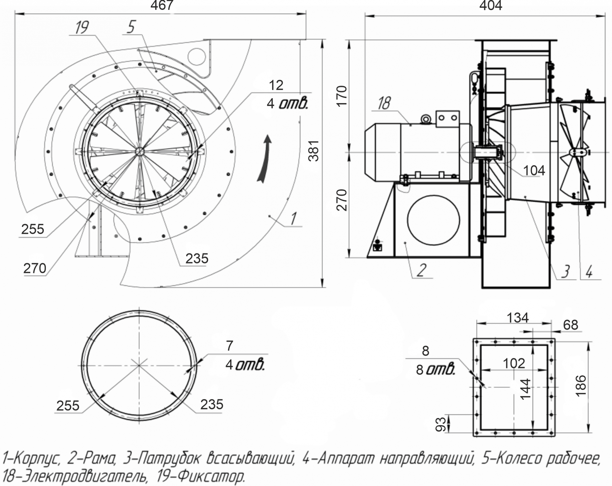 Дымососы ДН рассчитаны для перемещения дымовых газов и невзрывоопасных пылегазовоздушных смесей с температурой от -30 до +200°С, запылённостью до 0,2 г/м3. температура окружающей среды от -40 до +40°С. Дымососы могут быть изготовлены с правым и левым вращением рабочего колеса и углами поворота нагнетательного патрубка от 0° до 270° через 15°. В зависимости от типоразмера дымососа и пожелания Заказчика в комплект поставки может входить (или не входить) направляющий аппарат, который служит для регулирования производительности дымососа. На картинке показан дымосос правого вращения с положением нагнетательного патрубка 0° и с направляющим аппаратом.