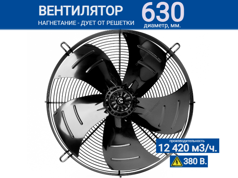 - Диаметр лопастей: 630 мм, подходит для создания мощного поток воздуха, необходимого для вентиляции больших площадей.
