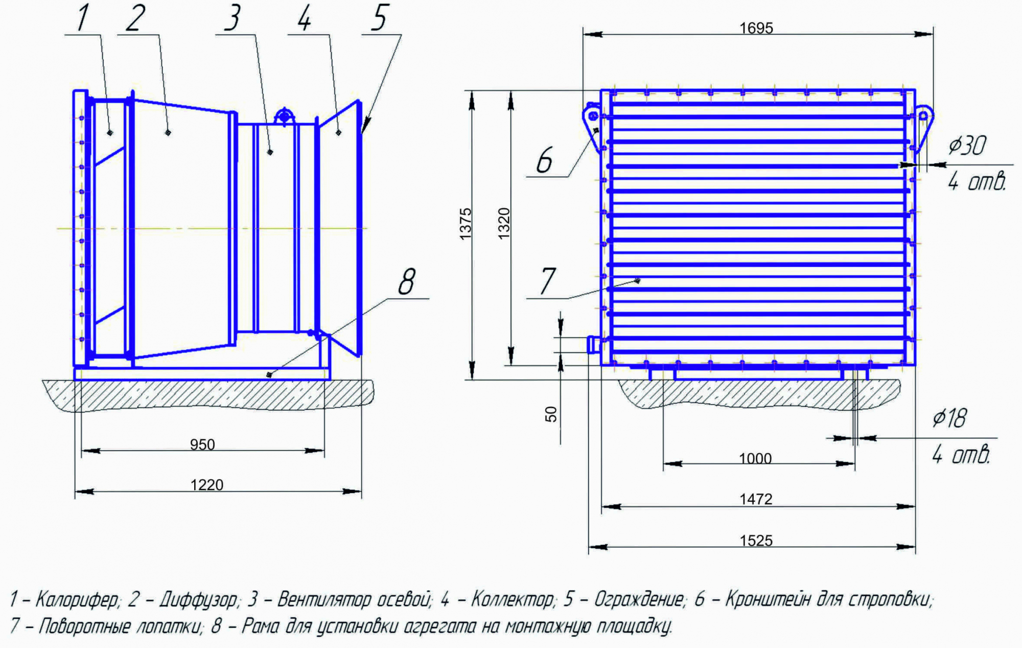 Отопительный агрегат АО представляет собой конструкцию из калорифера, вентилятора осевого, диффузора и рамы. В производстве отопительного агрегата АО применяются калориферы типа КСк или КП-Ск (в зависимости от виде теплоносителя). В качестве теплоносителя используется пар или горячая вода.